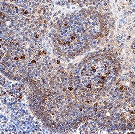 B7‑2/CD86 was detected in immersion fixed paraffin-embedded sections of human appendix using Mouse Anti-Human B7‑2/CD86 Monoclonal Antibody (Catalog # MAB108521) at 5 µg/mL for 1 hour at room temperature followed by incubation with the Anti-Mouse IgG VisUCyte™ HRP Polymer Antibody (VC001). Before incubation with the primary antibody, tissue was subjected to heat-induced epitope retrieval using Antigen Retrieval Reagent-Basic (CTS013). Tissue was stained using DAB (brown) and counterstained with hematoxylin (blue). Specific staining was localized to lymphocytes in appendix. Staining was performed using our protocol for IHC Staining with VisUCyte HRP Polymer Detection Reagents.