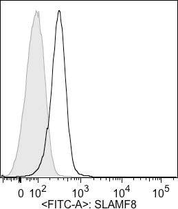 Gated on monocyte FSC-A and SSC-A population. Singlets were further gated on by FSC-A/FSC-H doublet exclusion. Isotype control shaded grey, SLAMF8 in open histogram.