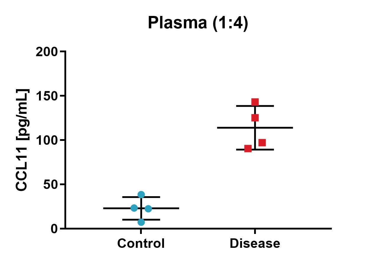 Tested human plasma & urine at 4-fold dilution. All urine samples (control & disease) were BLQ. All healthy control plasma was BLQ. Plasma from patient samples was in range.