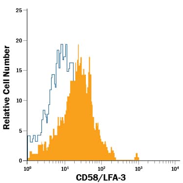 Detection of CD58/LFA‑3 in Human Peripheral Blood Monocytes by Flow Cytometry. Human peripheral blood monocytes were stained with Mouse Anti-Human CD58/LFA-3 APC-conjugated Monoclonal Antibody (Catalog # FAB1689A, filled histogram) or isotype control antibody (Catalog # IC0041A, open histogram). View our protocol for Staining Membrane-associated Proteins.