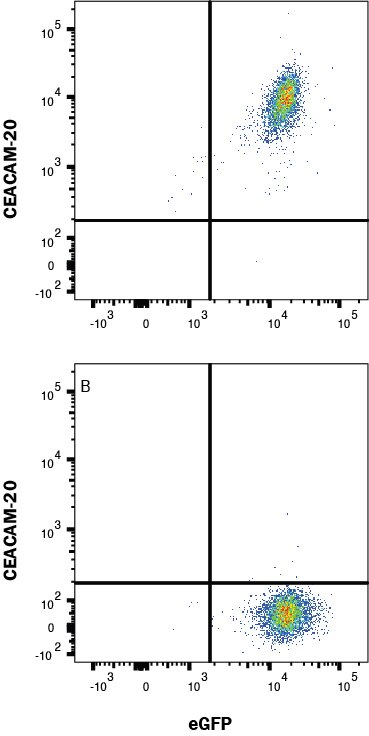 HEK293 human embryonic kidney cell line transfected with (A) human CEACAM-20 or (B) irrelevant protein, and eGFP was stained with Mouse Anti-Human CEACAM-20 Monoclonal Antibody (Catalog # MAB9416) followed by Allophycocyanin-conjugated Anti-Mouse IgG Secondary Antibody (F0101B). Quadrant markers were set based on control antibody staining (MAB002). Staining was performed using our Staining Membrane-associated Proteins protocol.