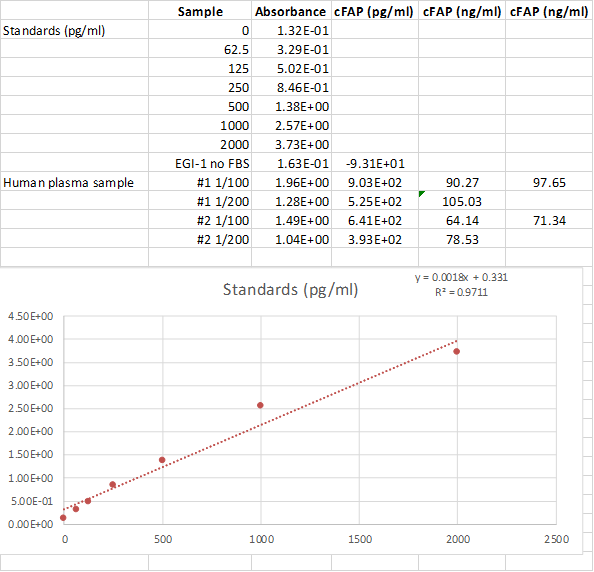 Human Plasma samples diluted between 1/100 and 1/200 fit perfectly in the standard curve.