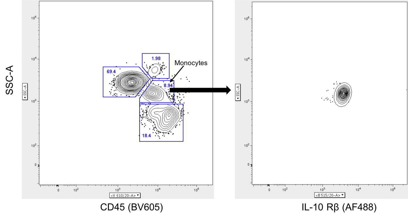 This antibody was used to stain human peripheral blood for analysis by flow cytometry. Monocytes were identified from CD45+ leukocytes and IL-10Rbeta expression was measured in the FITC channel. This antibody achieves consistent fluorescence which is maintained after fixation