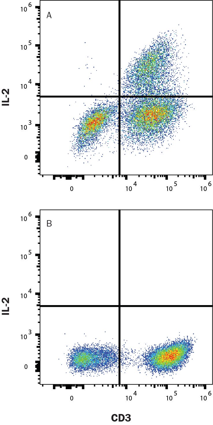 Recombinant Interleukin-2 (IL-2) is expressed in E. coli and has been engineered to contain the serine for cysteine substitution found in Proleukin® (aldesleukin). Recombinant IL-2 is widely used in cell culture for the expansion of T cells. IL-2 is expressed by CD4+ and CD8+ T cells, gamma delta T cells, B cells, dendritic cells, and eosinophils (1-3). Mature human IL-2 shares 56% and 66% amino acid (aa) sequence identity with mouse and rat IL-2, respectively. Human and mouse IL-2 exhibit cross-species activity (4). The receptor for IL-2 consists of three subunits that are present on the cell surface in varying preformed complexes (5-7). The 55 kDa IL-2 R alpha is specific for IL-2 and binds with low affinity. The 75 kDa IL-2 R beta, which is also a component of the IL-15 receptor, binds IL-2 with intermediate affinity. The 64 kDa common gamma chain gamma c/IL-2 R gamma, which is shared with the receptors for IL-4, -7, -9, -15, and -21, does not independently interact with IL-2. Upon ligand binding, signal transduction is performed by both IL-2 R beta and gamma c.