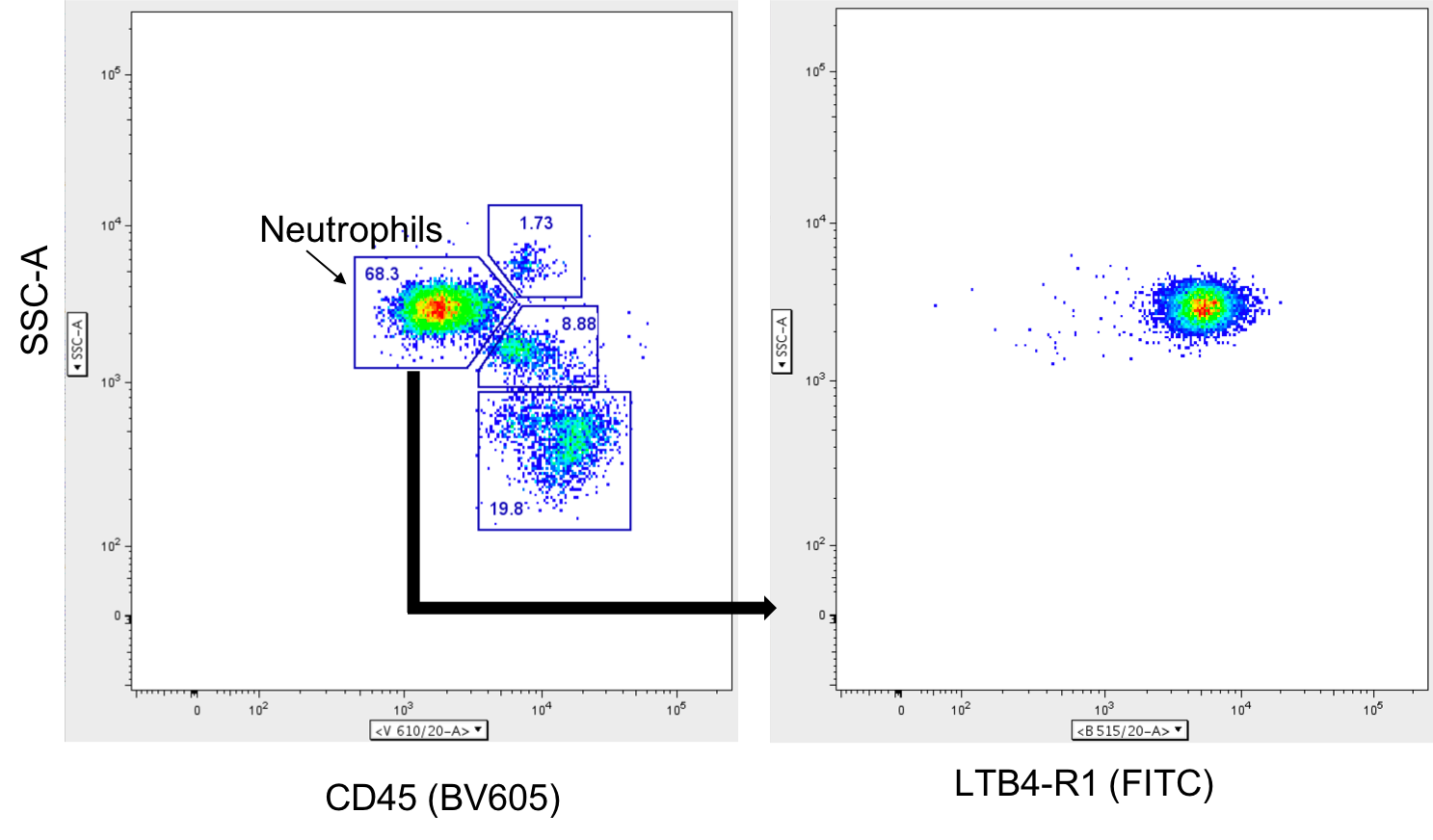 This antibody was used to stain human peripheral whole blood for analysis by flow cytometry. Neutrophils were identified from total live CD45+ leukocytes and expression of the LTB4 receptor was measured in the FITC channel. Consistent fluorescence is observed after fixation in 4% PFA. Good antibody for staining granulocytes