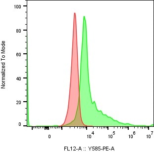 Expression of M-CSFR on human monocyte-derived dendritic cells. The cells were treated with 5 μl of the M-CSFR PE antibody (catalogue # FAB329P-100) (green) or mouse IgG1 PE isotype control antibody (red)