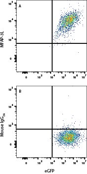 HEK293 cells transfected with hMFAP-3L and eGFP were stained with either (A) Mouse Anti-Human MFAP3L Monoclonal Antibody (Catalog # MAB113251) or (B) Mouse IgG2A Isotype Control (Catalog # MAB003). View our protocol for Staining Membrane-associated Proteins.