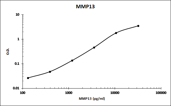 Matrix metalloproteinases are a family of zinc and calcium dependent endopeptidases with the combined ability to degrade all the components of the extracellular matrix. MMP-13 (Collagenase-3) has been demonstrated to degrade a range of extracellular matrix proteins, including collagen types I, II, III, IV, IX, X and XIV, gelatin, aggrecan, perlecan and fibronectin. MMP-13 is distinguished from the other human collagenases by its effecient degradation of type II collagen. MMP-13 is expressed by fibroblasts, chrondrocytes and squamous epithelial cells. Structurally, MMP-13 may be divided into several distinct domains; a pro-domain which is cleaved upon activation; a catalytic domain containing the zinc binding site; a short hinge region and a carboxyl terminal (hemopexin-like) domain.