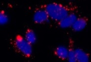 HHEX in K562 Human Cell Line. HHEX was detected in immersion fixed K562 human chronic myelogenous leukemia cell line using Rabbit Anti-Human/Mouse/Rat HHEX Polyclonal Antibody (Catalog # MAB83771) at 3 µg/mL for 3 hours at room temperature. Cells were stained using the NorthernLights™ 557-conjugated Anti-Rabbit IgG Secondary Antibody (red; Catalog # NL004) and counterstained with DAPI (blue). Specific staining was localized to nuclei. View our protocol for Fluorescent ICC Staining of Non-adherent Cells.