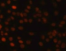 RUNX3/CBFA3 in Human PBMCs. RUNX3/CBFA3 was detected in immersion fixed human peripheral blood mononuclear cells (PBMCs) using Mouse Anti-Human/Mouse RUNX3/CBFA3 Monoclonal Antibody (Catalog # MAB3765) at 10 µg/mL for 3 hours at room temperature. Cells were stained using the NorthernLights™ 557-conjugated Anti-Mouse IgG Secondary Antibody (red; Catalog # NL007) and counterstained with DAPI (blue). Specific staining was localized to nuclei. View our protocol for Fluorescent ICC Staining of Non-adherent Cells.