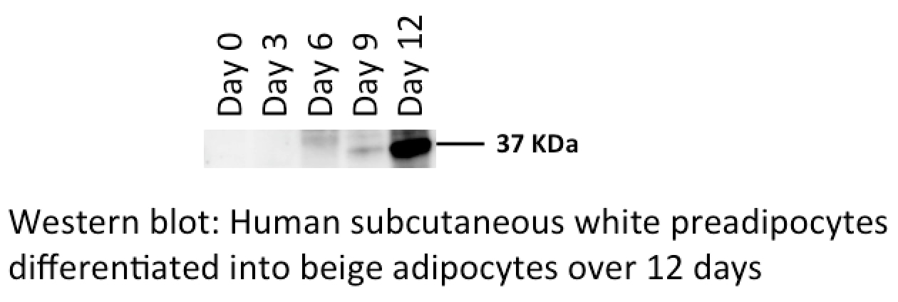 Mitochondrial brown fat uncoupling protein 1 (UCP1; also Thermogenin and UCP) is a 33 kDa member of the mitochondrial carrier family of proteins. Human and mouse UCP1 are both 307 amino acids (aa) in length and contain three solcar repetitive regions and six transmembrane segments. UCP1 is found in brown adipose tissue, where it becomes activated by fatty acids and inhibited by nucleotides. It functions as a mitochondrial transporter that creates a proton leak across the inner mitochondrial membrane, uncoupling oxidative phosphorylation from ATP synthesis. As a result, energy is dissipated in the form of heat. Human and mouse UCP1 share 79% aa sequence identity.