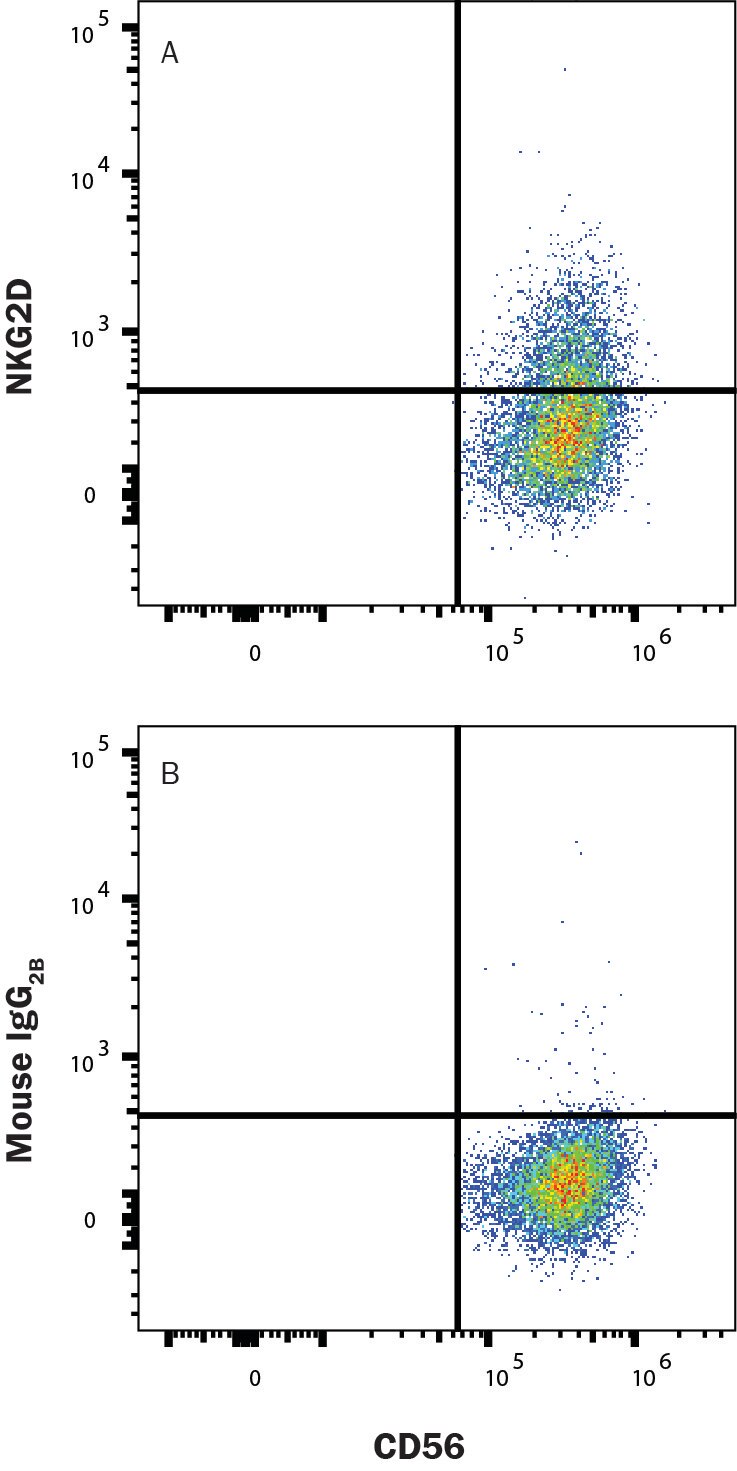 CD3- CD56+ naïve PBMC were stained with Rabbit Anti-Human NCAM‑1/CD56 PE‑conjugated Monoclonal Antibody (Catalog # FAB24086P) and either (A) Mouse Anti-Human NKG2D/CD314 Monoclonal Antibody (Catalog # MAB1392) or (B) Mouse IgG2B Isotype Control (Catalog # MAB004) followed by Allophycocyanin-conjugated Anti-Mouse IgG Secondary Antibody (Catalog # F0101B). View our protocol for Staining Membrane-associated Proteins.