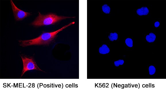 Sample: Fixed SK-Mel-28 human malignant melanoma cell line (Positive) and absent in K562 human chronic myelogenous leukemia cell line (Negative)