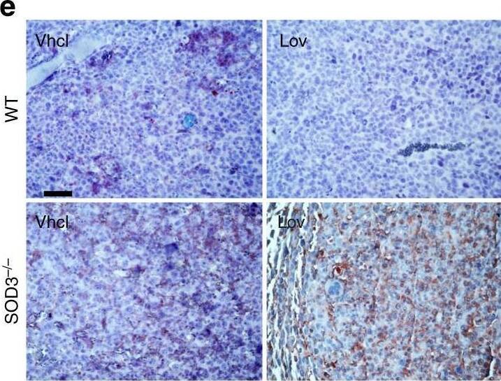 Detection of Mouse SOD3/EC-SOD by Immunohistochemistry SOD3 upregulation enhances Doxo chemotherapeutic effects. a, b LLC tumor growth kinetics in Vhcl-, Lov-, Doxo+Vhcl-, or Doxo+Lov-treated WT (a) and SOD3−/− mice (b). Arrows indicate treatment schedule (n = 10 mice/group). c Tumors from WT or SOD3−/− mice treated as above were dissected on day 16 and Doxo was quantified in tumor extracts. d Vhcl- and Lov-treated tumors from WT or SOD3−/− mice were dissected on day 18 (<1 cm3), and SOD3 and CD31 were detected in cryosections by immunohistochemistry (IHC); the two-color merge is shown (n = 10 fields/group; 4 mice/group). e 3-NT detection in paraffin sections of LLC tumors as in d (n = 15 fields/group; 4 mice/group). f LLC-GFP cells were implanted in WT or SOD3−/− mice, Lov-treated as in a, and tumors were dissected on day 21. LLC cells, ECs, and leukocytes were isolated by cell sorting and SOD3 mRNA was determined by qPCR. Data shown as mean ± SEM of triplicates (n = 5 mice/group). g Detection of SOD3 expression (red) and CD31 (green) in sections of Ad-C- or Ad-mSOD3-injected LLC tumors (dissected on day 18); nuclei are DAPI-stained (blue). Arrows in the SOD3 panel indicate the position of CD31+ cells. Bottom panel shows SOD3 fluorescence intensity quantified by ImageJ (15 images/group; 4 mice/group). h Growth kinetics of Ad-C- or Ad-mSOD3-injected LLC tumors. Arrows indicate treatment schedule (n = 9 mice/group). i Doxo quantification in extracts of tumors dissected on day 16 from mice treated as in h. *p < 0.05, **p < 0.01, ***p < 0.001 one-way ANOVA with Dunnett’s post-hoc test using Vhcl group as reference (a, b) or two-tailed Student’s t-test (f–i). Bar, 10 μm (d, g) and 50 μm (e) Image collected and cropped by CiteAb from the following open publication (https://pubmed.ncbi.nlm.nih.gov/29422508), licensed under a CC-BY license. Not internally tested by R&D Systems.