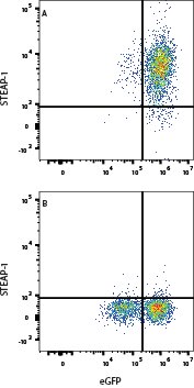 HEK293 cells transfected with Human STEAP-1 and eGFP (A) vs irrelevant cells (B) were stained with Rabbit Anti-Human STEAP1 APC-conjugated MonoclonalAntibody (Catalog # FAB55871A). View our protocol for Staining Membrane-associated Proteins.