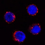 B7‑H2 in Mouse Splenocytes. B7-H2 was detected in immersion fixed mouse splenocytes using Rat Anti-Mouse B7-H2 Monoclonal Antibody (Catalog # MAB158) at 8 µg/mL for 3 hours at room temperature. Cells were stained using the NorthernLights™ 557-conjugated Anti-Rat IgG Secondary Antibody (red; Catalog # NL013) and counterstained with DAPI (blue). Specific staining was localized to cell surfaces. View our protocol for Fluorescent ICC Staining of Non-adherent Cells.
