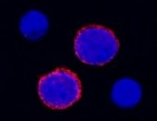 CD27/TNFRSF7 in Mouse Splenocytes. CD27/TNFRSF7 was detected in immersion fixed mouse splenocytes using Rat Anti-Mouse CD27/TNFRSF7 Monoclonal Antibody (Catalog # MAB574) at 8 µg/mL for 3 hours at room temperature. Cells were stained using the NorthernLights™ 557-conjugated Anti-Rat IgG Secondary Antibody (red; Catalog # NL013) and counterstained with DAPI (blue). Specific staining was localized to plasma membrane. View our protocol for Fluorescent ICC Staining of Non-adherent Cells.