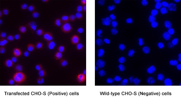 Sample: Immersion fixed CHO-S transfected (positive) and CHO-S wild type (negative) cells