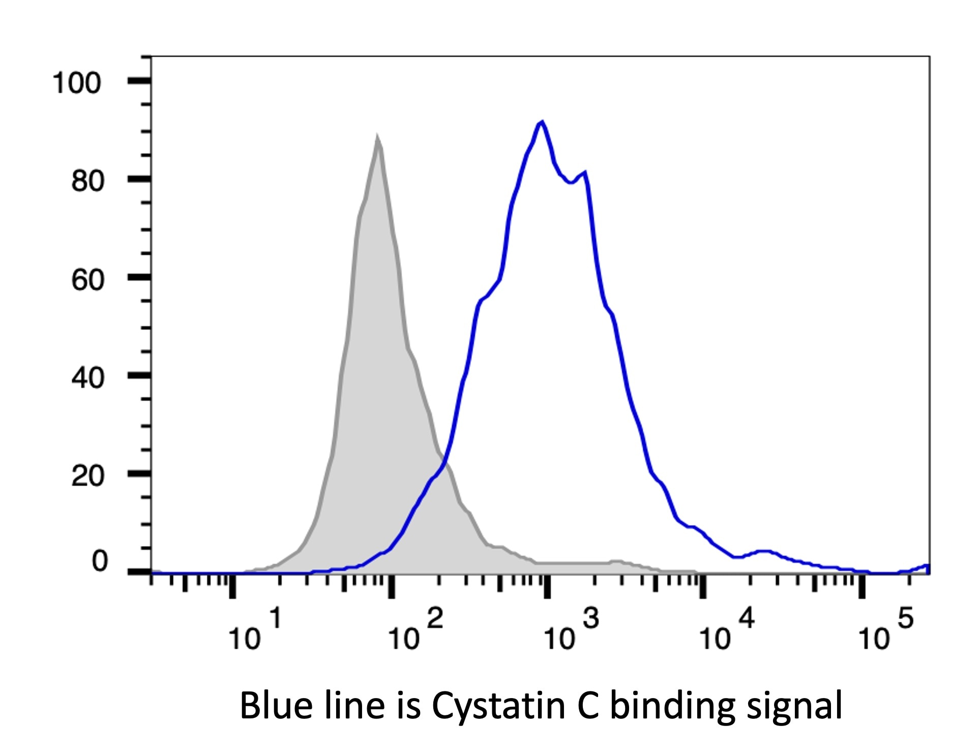 Cystatin C is a member of family 2 of the cystatin superfamily (1). It is involved in processes such as tumor invasion and metastasis, inflammation and some neurological diseases. It inhibits many cysteine proteases such as papain and cathepsins B, H, K, L and S (2, 3). All mouse tissues analyzed expressed Cystatin C, with relative levels similar to those of rat and human tissues. For all three species, brain and liver had the highest and lowest levels of Cystatin C, respectively, whereas kidney, spleen and muscle had the levels in between (4). The high degree of similarity in distribution and functional properties for mouse, rat and human Cystatin C indicates that a murine model should be relevant for studies of the human disease, hereditary Cystatin C amyloid angiopathy (4).