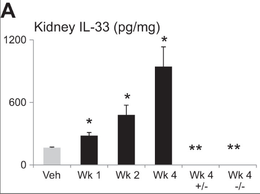 Mice underwent cisplatin-induced acute kidney injury (AKI) and IL-33 was measured in the kidneys every week for 4 weeks. We found an increase in IL-33 each week, which was prevented by knockout of IL-33. Interestingly, mice that were +/- for IL-33 also had no detectable IL-33 in the kidneys