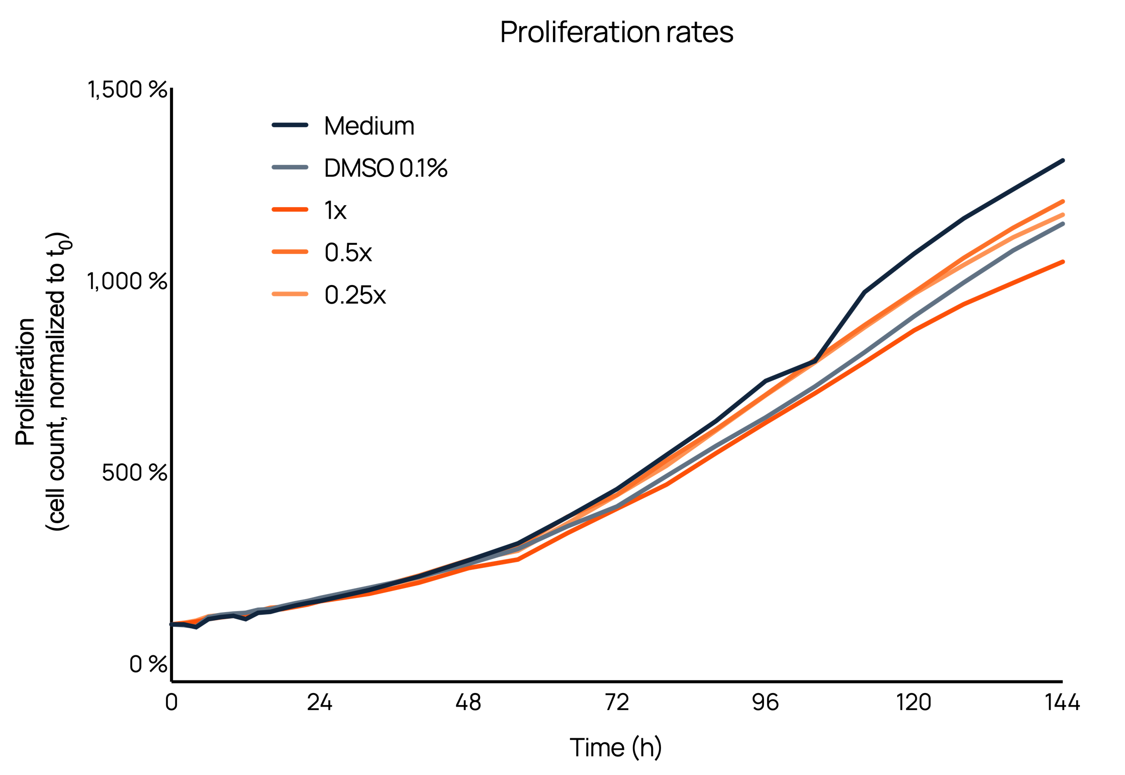 NucleoLIVE™ Non-Toxic Dye Application. Comparison of proliferation rates in MCF-7 cells: stable nuclear GFP reporter line versus NucleoLIVE™ staining at various concentrations (1×: 1:1,000; 0.5×: 1:2,000; 0.25×: 1:4,000). Controls include untreated (“Medium”) and 0.1% DMSO. Assays performed on an Incucyte Live-Cell Analysis System by Prof. John Hawse, Mayo Clinic.