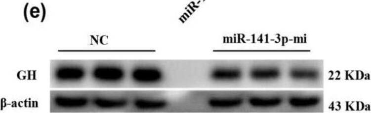 Detection of Growth Hormone by Western Blot miR-141-3p negatively regulates growth hormone (GH) mRNA and protein expression. GH3 cells were separately transfected with 100 pM miR-141-3p mimic and miR-141-3p inhibitor. Forty-eight hours later, GH3 cells were collected. (a,b) Analysis of miR-141-3p levels by qRT-PCR. (c,d) Analysis of GH1 mRNA levels by qRT-PCR. (e,f) Analysis of GH protein levels by Western blot and quantitative analysis of the Western blot results. Results are presented as the means ± SEM (n = 3). *, p < 0.05, **, p < 0.01, (t test). iNC, inhibitor negative control. Image collected and cropped by CiteAb from the following open publication (https://pubmed.ncbi.nlm.nih.gov/30011963), licensed under a CC-BY license. Not internally tested by R&D Systems.