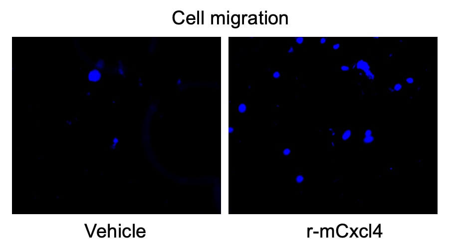 CXCL4, also called PF4 (platelet factor 4), is an 8 kDa member of the CXC chemokine family, sharing features with CXCL8/IL-8 and CXCL7/NAP-2 (1-3). Mature mouse CXCL4 shares 76%, 88%, 64%, 64% and 63% amino acid sequence identity with human, rat, ovine, porcine and bovine CXCL4, respectively. The active protein is a tetramer of CXCL4 subunits that forms a ring of heparin-binding positive charges from sites at the C-terminal region of each monomer (3). Megakaryocytes synthesize CXCL4 and store it in platelet alpha -granules (2, 3). Secretion from activated platelets can produce micromolar levels in serum and over 100‑fold higher within clots (2, 3). In contrast to other CXC chemokines, CXCL4 does not contain an ELR motif and lacks binding to nearly all chemokine receptors (2, 3). A potential high-affinity G-protein-coupled receptor for CXCL4, the CXCR3 isoform CXCR3B, is expressed in human but not mouse (2, 3). In most cases, it is likely that cell surface binding and signaling properties of CXCL4 are due to binding of glycosaminoglycans chains, particularly chondroitin sulfates (2). CXCL4 released from activated platelets binds and regulates thrombin/thrombomodulin complexes, regulates and enhances production of activated Protein C (APC), and limits the coagulation cascade (2-6). It binds and influences the enzymatic activity of coagulation factor Xa (7). It binds fibrin and affects clot structure (8). Therapeutic doses of the anticoagulant heparin neutralize CXCL4 procoagulant effects (9). The complex between heparin and CXCL4 can be immunogenic, and circulating CXCL4-heparin antibodies cause the human syndrome HITT (heparin-induced thrombocytopenia and thrombosis, also called HIT) (2). In addition, immunogenic complexes of CXCL4 with apolipoprotein H can contribute to antiphospholipid syndrome (APS) (10). CXCL4 can be antiproliferative and antiangiogenic, at least in part via interfering with FGF-2 and VEGF heparin binding and thus inhibiting their signaling (3, 11-13). However, it can also be proinflammatory and pro‑atherogenic through multiple effects on monocytes, macrophages and endothelial cells (2, 3).