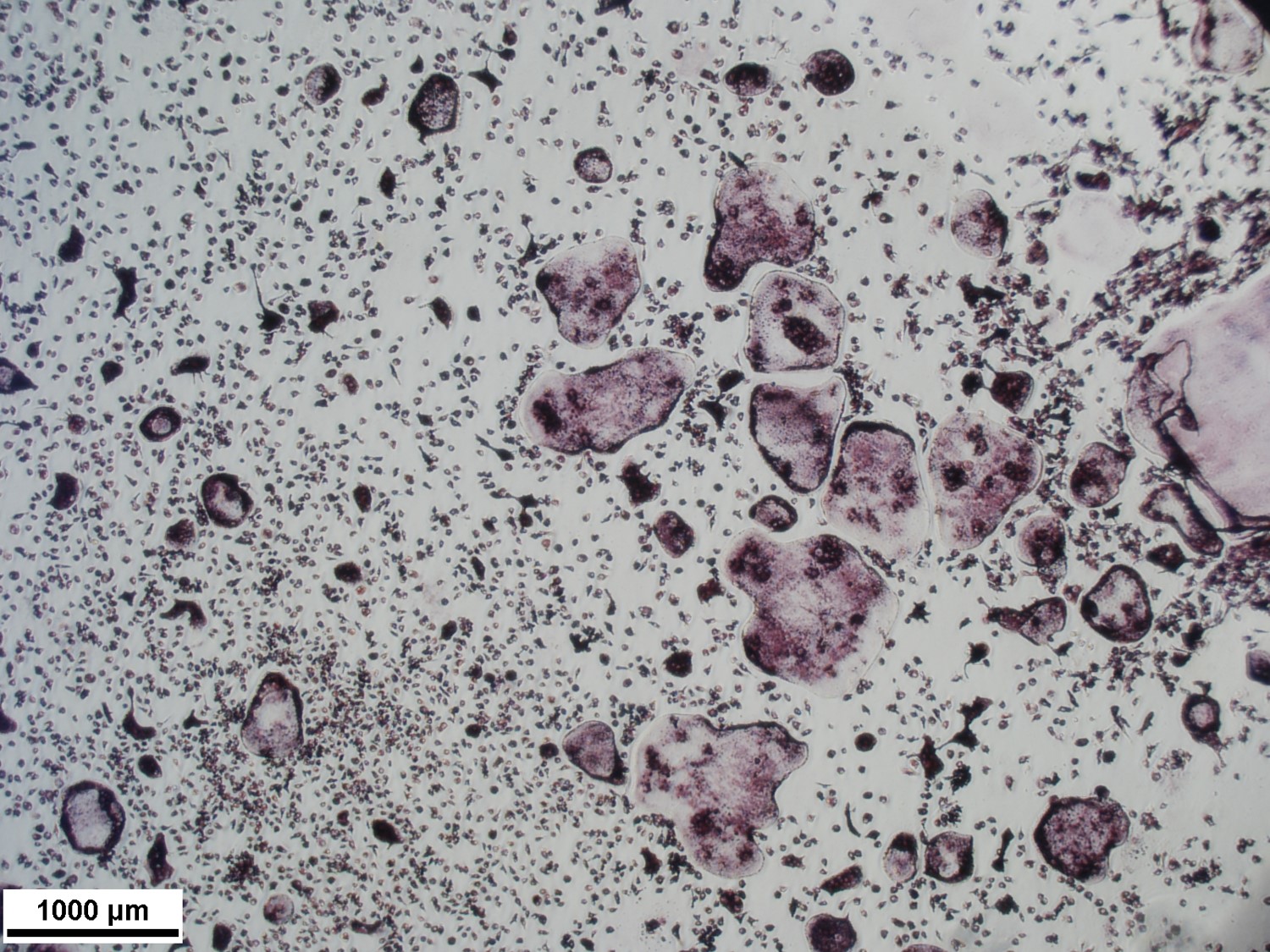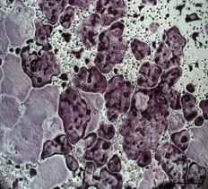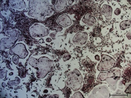 Bone marrow macrophages grown in media on osteoassay plates for 7 days then treated with 35ng/mL Rank L. After 14 days TRAP stained.