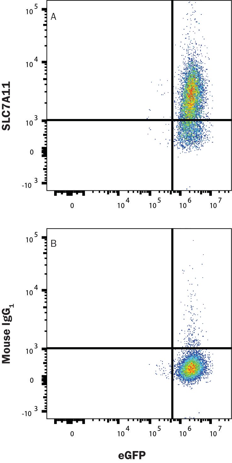 HEK293 human embryonic kidney cell line transfected with human xCT/SLC7A11 and eGFP was stained with (A) Mouse Anti-Human xCT/SLC7A11 Monoclonal Antibody (Catalog # MAB11251) or (B) Mouse IgG1 control antibody staining (MAB002) followed by Allophycocyanin-conjugated Anti-Mouse IgG Secondary Antibody (F0101B). View our protocol for Staining Membrane-associated Proteins.