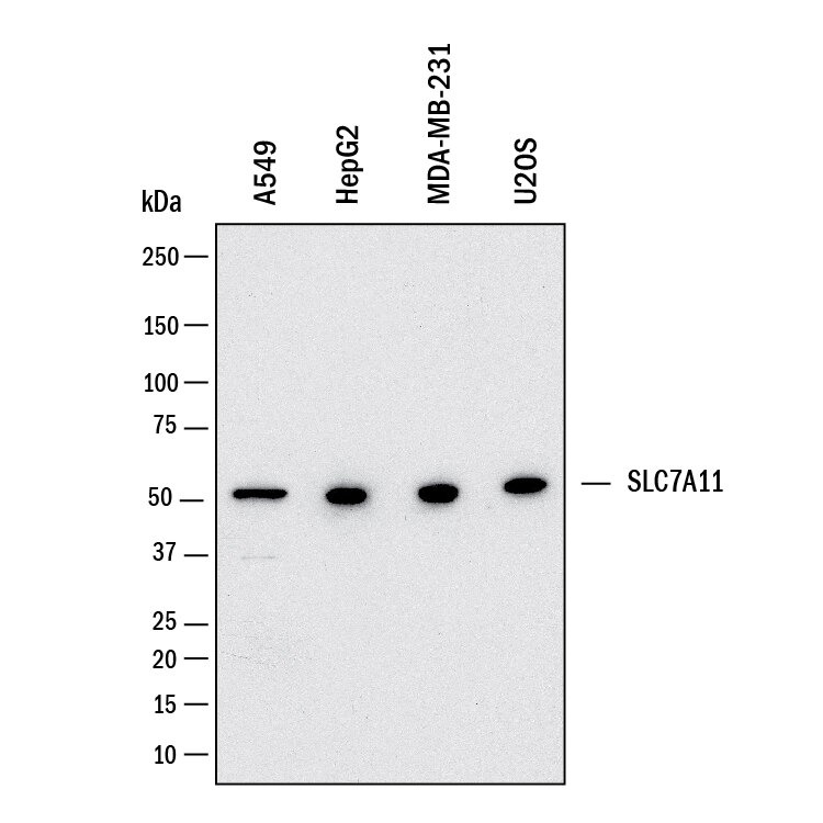 Western blot shows lysates of A549 human lung carcinoma cell line, HepG2 human hepatocellular carcinoma cell line, MDA‑MB‑231 human breast cancer cell line, U2OS human osteosarcoma cell line. PVDF membrane was probed with 2 µg/mL of Mouse Anti-Human xCT/SLC7A11 Monoclonal Antibody (Catalog # MAB11251) followed by HRP-conjugated Anti-Mouse IgG Secondary Antibody (Catalog # HAF018). A specific band was detected for xCT/SLC7A11 at approximately 55 kDa (as indicated). This experiment was conducted under reducing conditions and using Western Blot Buffer Group 1.
