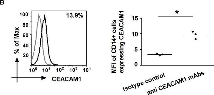 CEACAM-1, also known as CD66a, is an immunoglobulin superfamily protein that is expressed on neutrophils, activated NK cells, bile duct and colonic epithelial cells, and endothelial cells. CEACAM-1 is heavily glycosylated and carries high mannose residues and (sialyl) Lewis-x. It is expressed as at least three soluble and seven transmembrane isoforms, with variations occurring in both the ECD and cytoplasmic regions. It engages in homotypic adhesion and heterotypic adhesion with CEACAM-3/CD66d and CEACAM-6/CD66c. On neutrophils, CEACAM-1 additionally binds to dendritic cell DC-SIGN via its Lewis-x moiety, inducing dendritic cell maturation and a subsequent Th1-type response.