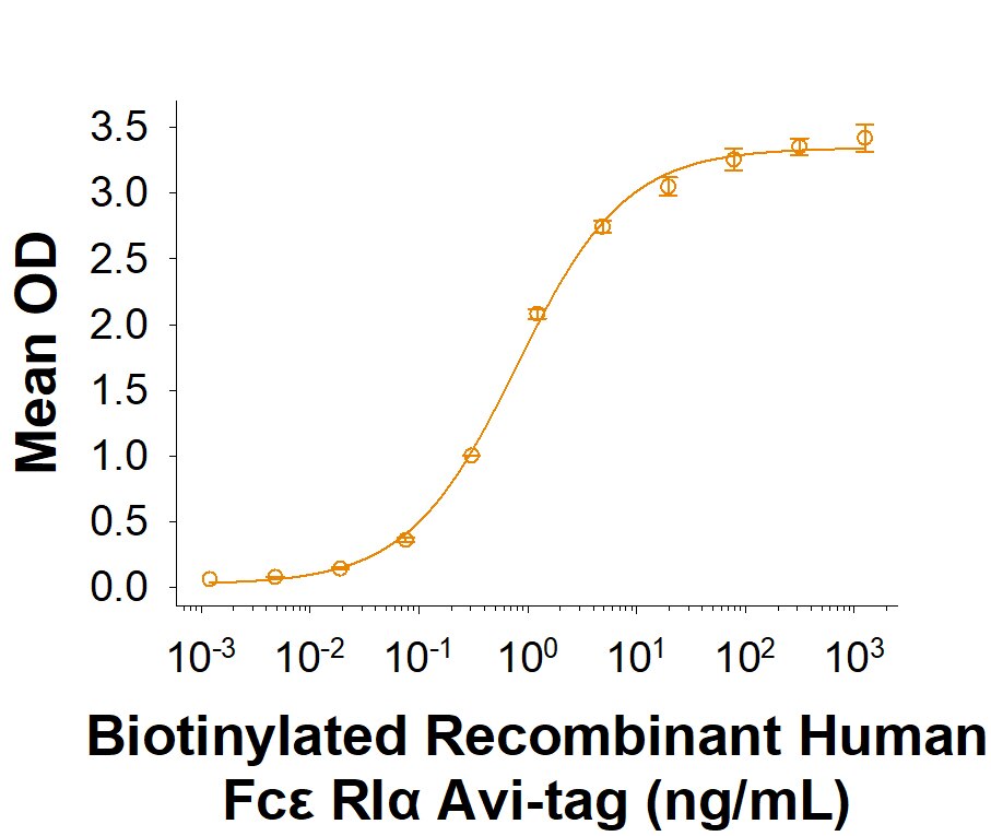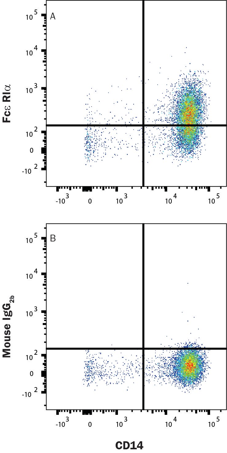 Fc epsilon RI alpha is a transmembrane protein that associates with beta and gamma subunits to form the high affinity IgE receptor on basophils and mast cells. Cellular activation by IgE/Fc epsilon RI crosslinking causes degranulation, releasing histamine, leukotrienes, prostaglandins, and other mediators of immediate‑type and lateâ€...