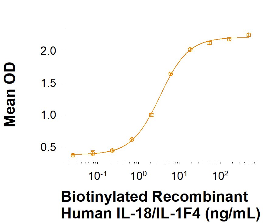 IL-18 (Interleukin-18) is secreted by macrophages, dendritic cells, and epithelial cells. Circulating mature IL-18 is sequestered by soluble IL-18 binding proteins (IL-18 BP) that inhibit IL-18 bioactivity. IL-18 signals through a receptor complex that contains IL-18 R alpha IL-18 R beta. It synergizes with other cytokines to activate NK, Th1, and ...