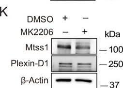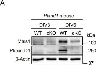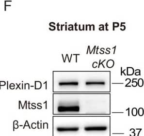 Plexin D1 is a type I transmembrane glycoprotein that is the prototype of the plexin D subfamily of semaphorin receptors. Human Plexin D1 contains a 46 amino acid (aa) signal sequence, a 1225 aa extracellular domain (ECD), a 21 aa transmembrane domain, and a 633 aa cytoplasmic domain that includes features common to other plexins. The human Plexin D1 ECD shares 89% identity with mouse Plexin D1, and approximately 84-92% aa identity based on incomplete sequences of rat, bovine, porcine and canine Plexin D1. It contains a sema domain, two plexin-semaphorin-integrin (PSI) or Met-related sequence (MRS) cysteine-rich motifs, and three glycine/proline-rich IPT/TIG domains which are immunoglobulin-like domains found in plexins, transcription factors, and the scatter factor receptors Met and Ron. Isoforms of 1787 and 1747 aa have been sequenced; these contain a 178 aa N-terminal deletion with or without a longer alternate C-terminus. Like other Sema/plexin interactions, Plexin D1 interacts with Sema3C or Sema4A via neuropilins. Interaction with Sema3E, however, is direct. Plexin D1/Sema3E interaction mediates vascular guidance during development or angiogenesis; deletion of either molecule results in similar, profound cardiac abnormalities. Plexin D1 is also expressed in lymphocytes, osteoblasts, the neural crest and the central nervous system during development. In the brain, the presence of neuropilin can change Plexin D1/Sema3E interaction from an attractive to a repulsive signal. Plexin D1 directs migration of thymocytes to the thymic medulla, probably through repulsion of Sema3E. Endothelial cell Plexin D1 binding to Sema4A can oppose VEGF and suppresses tumor angiogenesis, and expression of Sema3E correlates inversely with tumor metastasis, indicating that Plexin D1 is anti-metastatic in the presence of its ligands.