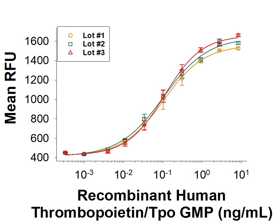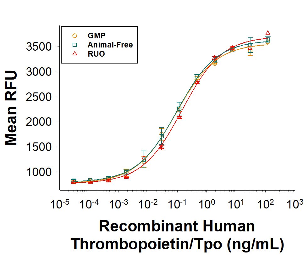 Thrombopoietin (Tpo), is a key regulator of megakaryocytopoiesis and thrombopoiesis. It is principally produced in the liver and is bound and internalized by the receptor Tpo R/c-mpl. Defects in the Tpo-Tpo R signaling pathway are associated with a variety of platelet disorders. Tpo promotes the differentiation, proliferation, and maturation of meg...