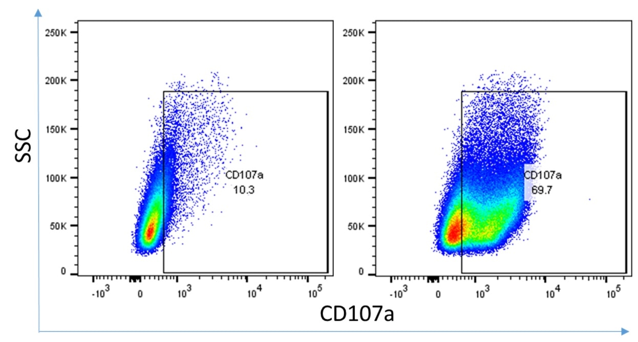 Tumor infiltrating lymphocytes (TILs) were isolated from mouse liver tumors and then stimulated with 1X cell activation cocktail (diluted in RPMI media). After 5 hour activation, cytokine production on the TILs was measured via flow cytometry. Example picture shows CD107A expression before and after activation.