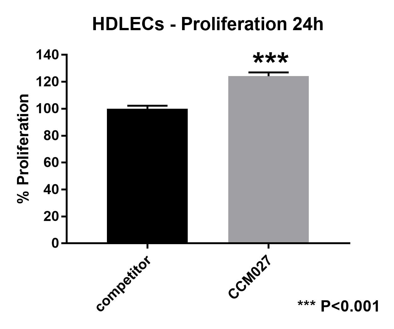 Improved Proliferation of Primary Human Dermal Lymphatic Endothelial Cells. Human dermal lymphatic endothelial cells (HDLECs) were cultured in either Endothelial Cell Growth Media (R&D Systems, Catalog # CCM027) or a competitor endothelial cell media. After 48 hours, HDLEC proliferation was assessed using a MTT proliferation assay. HDLECs cultured in R&D Systems Endothelial Cell Growth Medium showed a 24% increase in proliferation compared to competitor media. The P-value was calculated using an unpaired t-test. Data provided courtesy of the laboratory of Dr. Constantinos Mikelis at Texas Tech University Health Sciences Center.