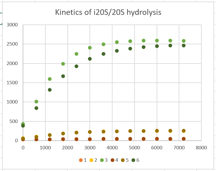 The hydrolysis activity of proteasome and immunoproteasome is considered to be lower than that of trypsin. About 15 nM is required in the co-presence of PA28 activator. At that time, the substrate concentration should be about 1 uM for the observation of the saturation level.
