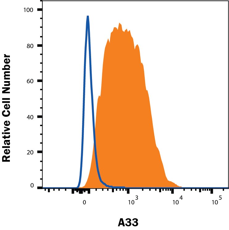 Human A33, also known as GPA33, is a 43 kDa type I transmembrane glycoprotein that belongs to the CTX (cortical thymocyte marker in Xenopus) family of cell adhesion molecules within the immunoglobulin superfamily. Other family members include CXADR, ESAM, BT-IgSF, CD2 and JAM-A-C. The extracellular domain (ECD) of human A33 is 214 amino acids (aa) in length and contains one V-type and one C2-type Ig-like domain. This ECD is 80%, 74% and 71% aa identical to canine, bovine and mouse A33 ECD, respectively. A33 is likely to be involved in cell-cell adhesion between epithelial cells.