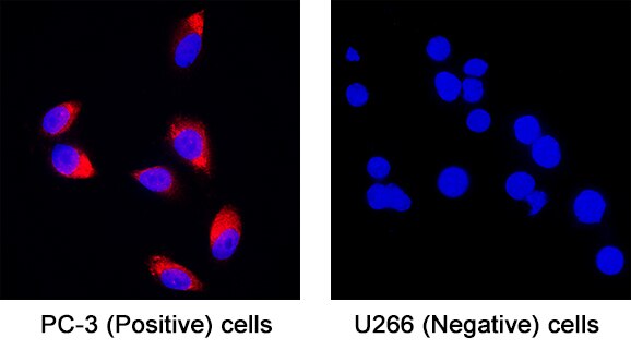 Activin B was detected in 10% Formalin fixed PC‑3 human prostate cancer cell line (Positive) and absent in U266 human myeloma cell line (Negative) using Mouse Anti-Human Activin B Precursor Monoclonal Antibody (Catalog # MAB11450) at 8 µg/ml for 3 hours at room temperature. Cells were stained using the NorthernLights™ 557-conjugated Anti-Mouse IgG Secondary Antibody (red; Catalog # NL007) and counterstained with DAPI (Blue). Specific staining was localized to cytoplasmic. View our protocol for Fluorescent ICC Staining of Cells on Coverslips.