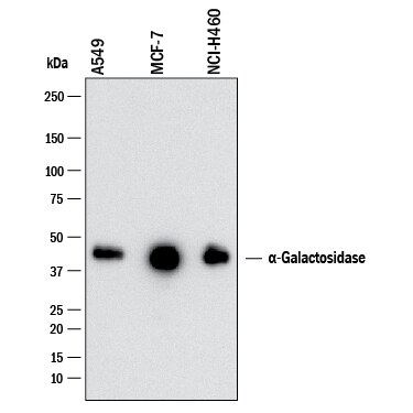 Western blot shows lysates of A549 human lung carcinoma cell line, MCF‑7 human breast cancer cell line and NCI‑H460 human large cell lung carcinoma cell line. PVDF membrane was probed with 1 µg/mL of Rabbit Anti-Human alpha ‑Galactosidase A/GLA Monoclonal Antibody (Catalog # MAB61462) followed by HRP-conjugated Anti-Rabbit IgG Secondary Antibody (Catalog # HAF008). A specific band was detected for alpha ‑Galactosidase A/GLA at approximately 45 kDa (as indicated). This experiment was conducted under reducing conditions and using Western Blot Buffer Group 1.