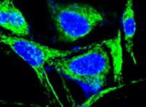 APLP‑1 in SH‑SY5Y Human Cell Line. APLP‑1 was detected in immersion fixed SH‑SY5Y human neuroblastoma cell line (positive staining) and MOLT‑4 human acute lymphoblastic leukemia cell line (negative staining) using Mouse Anti-Human APLP‑1 Monoclonal Antibody (Catalog # MAB3129) at 25 µg/mL for 3 hours at room temperature. Cells were stained using the NorthernLights™ 557-conjugated Anti-Mouse IgG Secondary Antibody (red; NL007) and counterstained with DAPI (blue). Specific staining was localized to cytoplasm. Staining was performed using our protocol for Fluorescent ICC Staining of Non-adherent Cells.