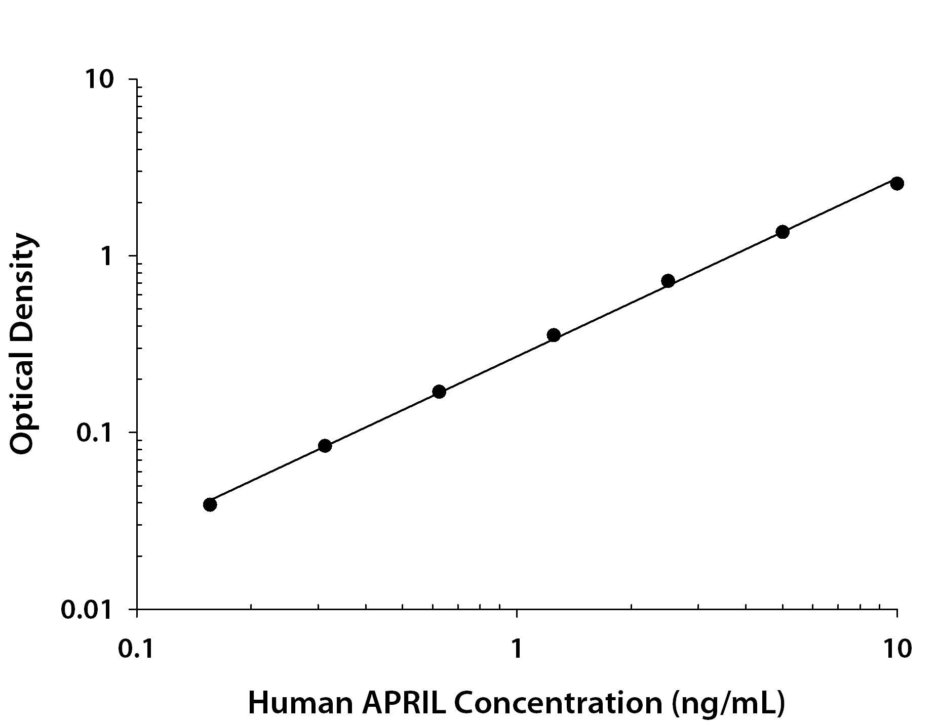 The Quantikine Human APRIL/TNFSF13 Immunoassay is a 4.5 hour solid-phase ELISA designed to measure human APRIL in cell culture supernates, serum, platelet-poor plasma, and saliva. It contains HEK293-expressed recombinant human APRIL and antibodies raised against the recombinant factor. Results obtained using natural human APRIL showed linear curves that were parallel to the standard curves obtained using the Quantikine kit standards. These results indicate that this kit can be used to determine relative mass values for naturally occurring human APRIL.