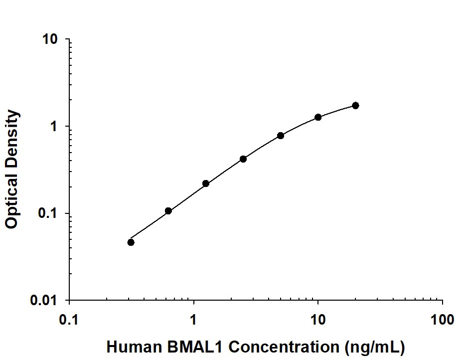 Recombinant Human BMAL1 protein was serially diluted 2-fold and captured by Mouse Anti-Human BMAL1 Monoclonal Antibody (MAB105601) coated on a Clear Polystyrene Microplate (DY990). Mouse Anti-Human BMAL1 Monoclonal Antibody (Catalog # MAB10560) was biotinylated and incubated with the protein captured on the plate. Detection of the standard curve was achieved by incubating Streptavidin-HRP (DY998) followed by Substrate Solution (DY999) and stopping the enzymatic reaction with Stop Solution (DY994).