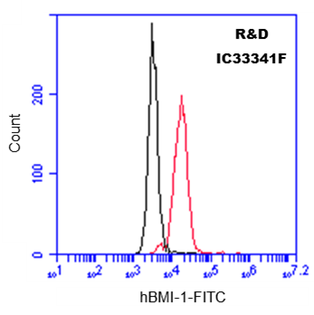 Detection of BMI‑1 in HeLa Human Cell Line by Flow Cytometry. HeLa human cervical epithelial carcinoma cell line was stained with Mouse Anti-Human BMI-1 Fluorescein-conjugated Monoclonal Antibody (Catalog # IC33341F, filled histogram) or isotype control antibody (Catalog # IC003F, open histogram). To facilitate intracellular staining, cells were fixed with Flow Cytometry Fixation Buffer (Catalog # FC004) and permeabilized with Flow Cytometry Permeabilization/Wash Buffer I (Catalog # FC005). View our protocol for Staining Intracellular Molecules.