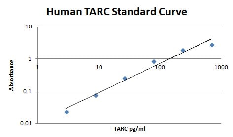 CCL17 is a novel CC chemokine identified using a signal sequence trap method. CCL17 cDNA encodes a highly basic 94 amino acid (aa)residue precursor protein with a 23 aa residue signal peptide that is cleaved to generate the 71 aa residue mature secreted protein. Among CC chemokine family members, CCL17 has approximately 24 - 29% amino acid sequence identity with RANTES, MIP-1 alpha, MIP-1 beta, MCP-1, MCP-2, MCP-3 and I-309. The gene for human CCL17 has been mapped to chromosome 16q13 rather than chromosome 17 where the genes for many human CC chemokines are clustered. CCL17 is constitutively expressed in thymus, and at a lower level in lung, colon, and small intestine. CCL17 is also transiently expressed in stimulated peripheral blood mononuclear cells. Recombinant CCL17 has been shown to be chemotactic for T cell lines but not monocytes or neutrophils. CCL17 was identified to be a specific functional ligand for CCR4, a receptor that is selectively expressed on T cells.