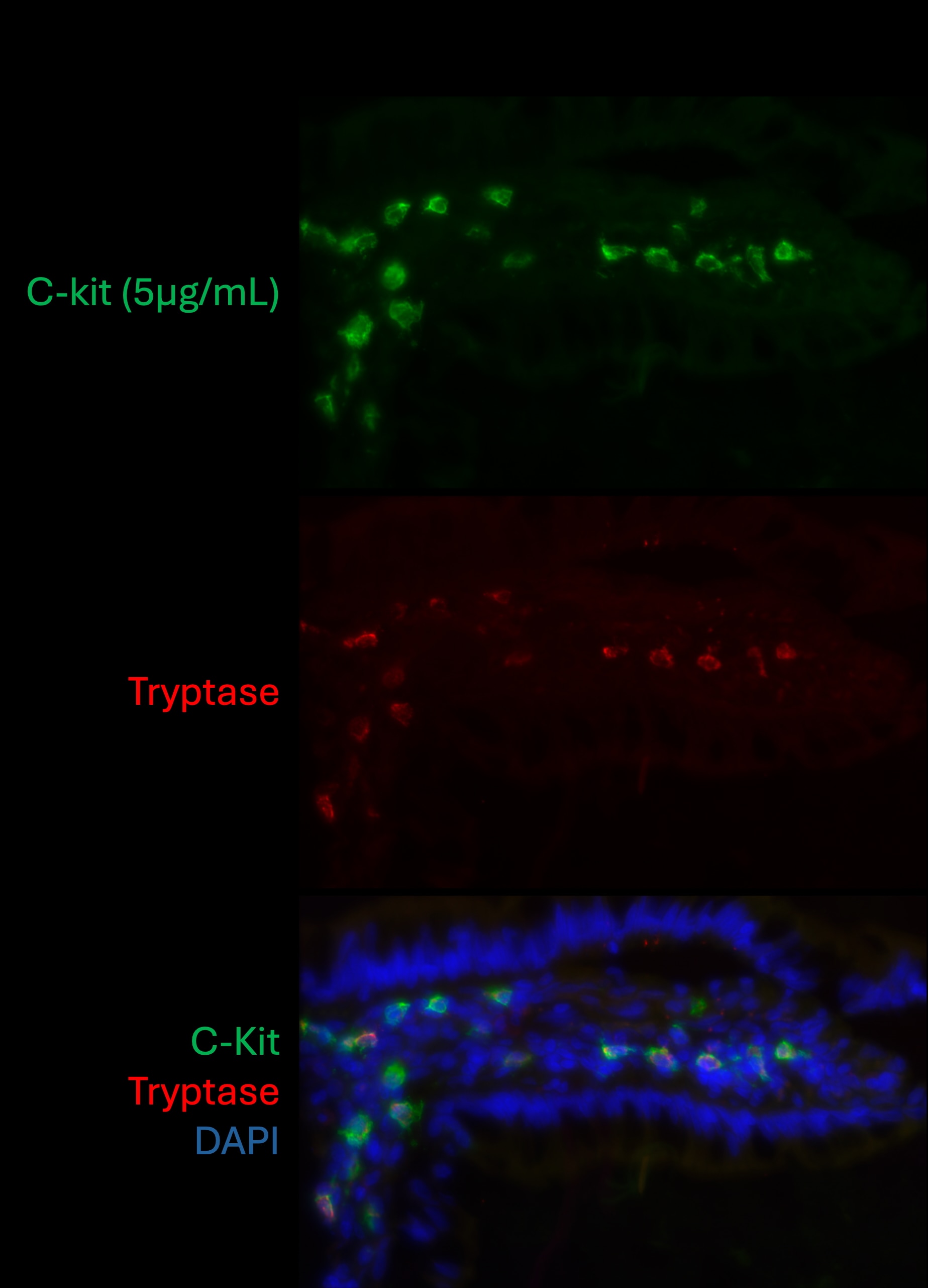 CD117/c-kit in Human Small Intestine. Tissue fixed in 4% PFA for 1 hour, and cryoprotected in 30% sucrose for 24 hours. Tissue frozen in OCT compound and cut at 10um thickness. Blocked for 1 hour in protein block and stained at 5 ug/mL. Image from a verified customer review.