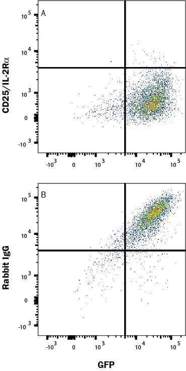 Human PBMCs were treated with Recombinant Human IL-2 (202-IL,20 ng/mL) and TGF-beta (100-B,10 ng/mL) for 24 hours, then stained with (A) Rabbit anti-Human CD25/IL-2 Ra Monoclonal Antibody (Catalog # MAB10203) or (B) Rabbit IgG control antibody (MAB1050), followed by PE-conjugated Anti-Rabbit IgG Secondary Antibody (F0110) and Mouse anti-Human CD3 APC-conjugated Monoclonal Antiobdy (FAB100A). View our protocol for Staining Membrane-associated Proteins.