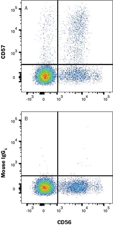 Detection of CD57 in PBMC by Flow Cytometry PBMC were stained with Rabbit Anti-Human NCAM‑1/CD56 PE‑conjugated Monoclonal Antibody (Catalog # FAB24086P) and either (A) Mouse Anti-Human CD57 Monoclonal Antibody (Catalog # MAB11708) or (B) isotype control antibody (Catalog # MAB002) followed by Allophycocyanin-conjugated Anti-Mouse IgG Secondary Antibody (Catalog # F0101B). View our protocol for Staining Membrane-associated Proteins.