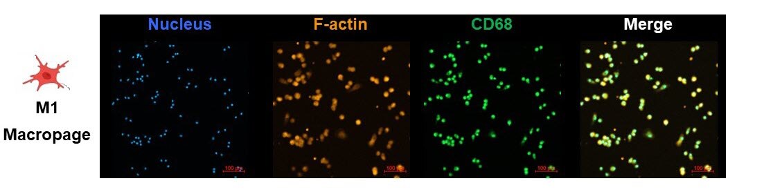Samples were firstly permeabilized with 0.25% Triton X-100 in PBS for 30 minutes and subsequently washed once with wash buffer. Samples were then firstly stained with phalloidin and left for 3 hours in darkness. Subsequently, they were washed one time with wash buffer, and then incubated with blocking solution (1% BSA in 1x PBS) for 1 hour. Then samples were washed one time with wash buffer and incubated with CD68 staining pre-made at 8 µg/mL with 0.1% BSA in PBS overnight in darkness. Subsequently samples were washed one more time with wash buffer and incubated with DAPI for 10 mins.